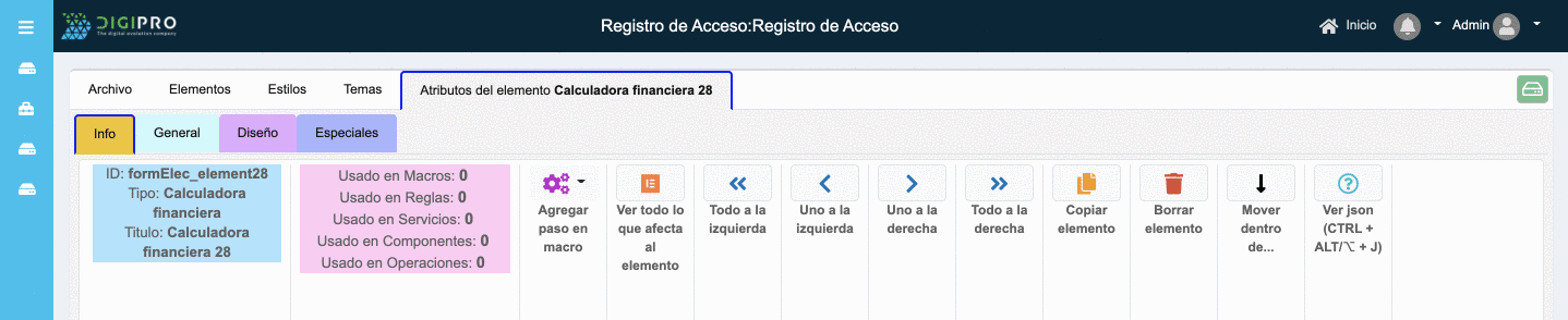 Atributos para automatizar y visualizar las macros, reglas, servicios, componentes y operaciones involucradas en el componente, así como también, un acceso directo a cada uno de ellos.