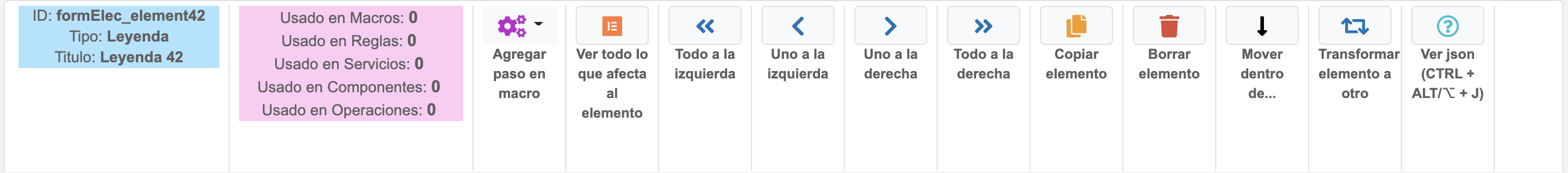 Atributos informativos para indicar la cantidad de macros, reglas, servicios, componentes y operaciones en realción con el elemento, es decir, si alguno de los listados involucra al elemento se sumará en este review informativo.