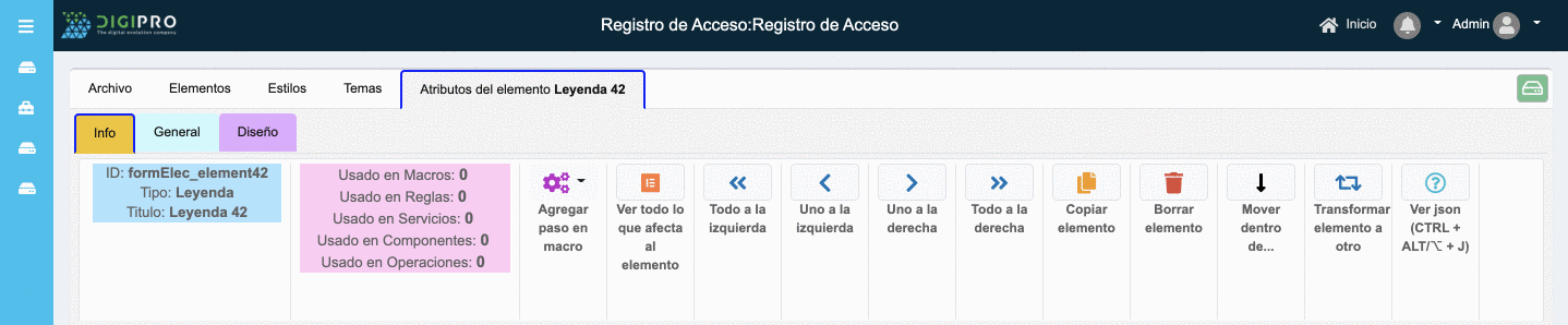 - Info.- El grupo de información contiene herramientas para poder manipular la unicación del elemento así como también conocer el detalle general del elemento y los elementos adicionales relacionados con el mismo.