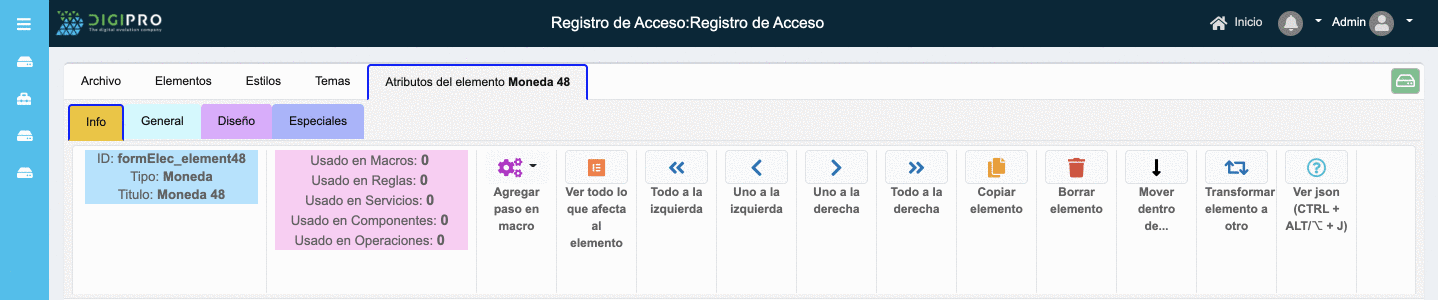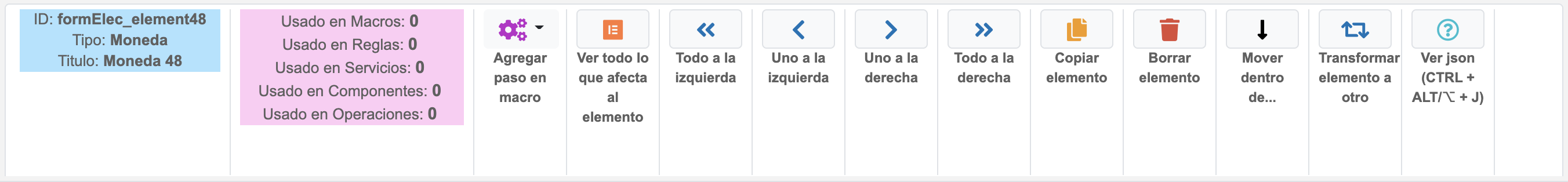 Atributos informativos para indicar la cantidad de macros, reglas, servicios, componentes y operaciones en realción con el elemento, es decir, si alguno de los listados involucra al elemento se sumará en este review informativo.